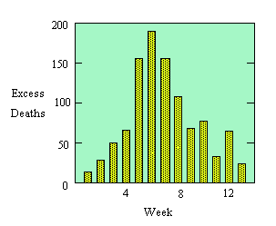 The name "SIR Model" refers to a division of the population into three mutually exclusive groups: the susceptible population \(S\), the infected population \(I\), and the recovered population \(R\). For the Hong Kong flu in New York City in 1968, we know that the total population was approximately \(7,900,000\). The crucial variable is \(I\), the number of infecteds at different times, which was difficult to determine because a large number of ill people did not go to a doctor and so were unreported. The available data (Figure 1 and Table 1) consist of weekly totals of excess pneumonia-influenza deaths, that is, the number of such deaths in excess of the average number to be expected from other causes. Those who die as a result of the disease probably will not do so right away. We assume that the number of excess deaths is proportional to the number of infected individuals from a couple of weeks before.